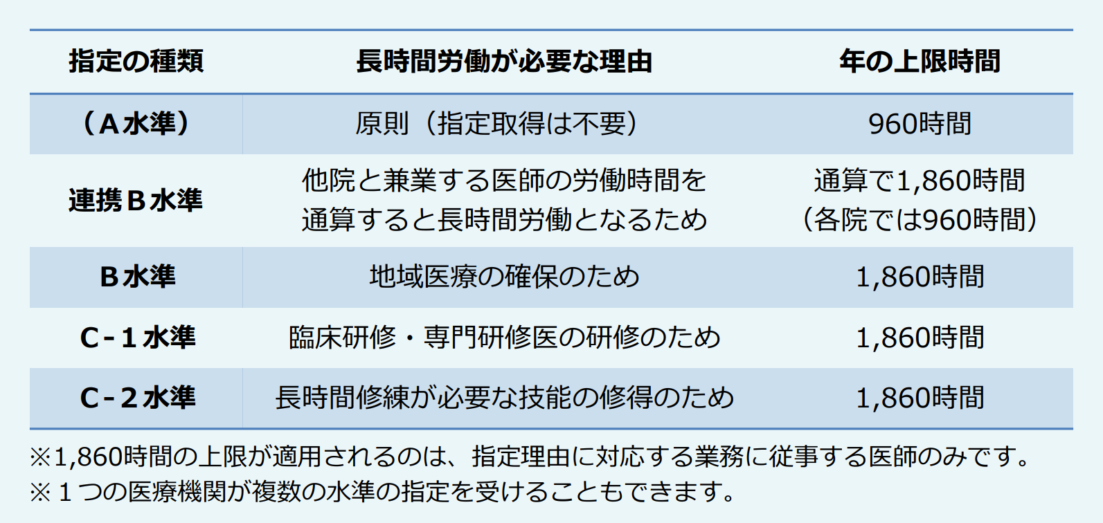 医師に対する時間外労働の上限規制には、上記のA水準のほか、地域の医療提供体制の確保のために暫定的に認められる水準(連携B水準、B水準) 及び集中的に技能を向上させるために必要な水準(C水準)があり、これらでは②㋐の時間外労働及び休日労働時間数の年の上限は1860時間とされています。都道府県知事から指定を受けることが条件なのですが、A水準よりも規制が緩和されています(以下の厚労省作成の表をご参照ください。)。